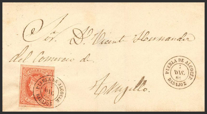 64. 1864. 4 red cuartos . PUEBLA FROM ALCOCER to TRUJILLO. Postmark PUEBLA DE ALCOCER / BADAJOZ, pre-philatelic mark ESPARRAGOSA DE LARES / ESTREMADURA / BAXA on the back. MAGNIFICENT.