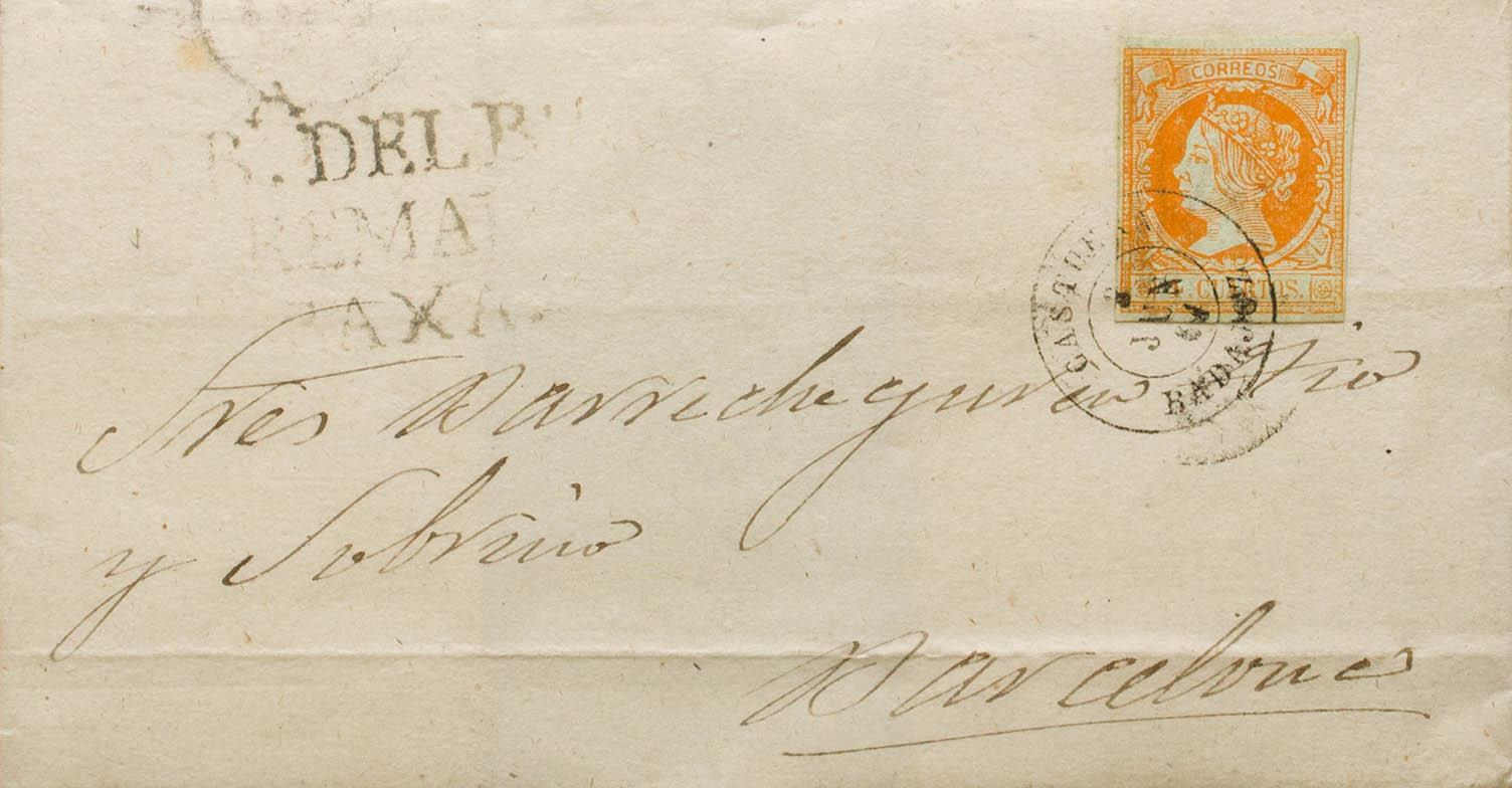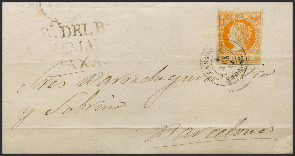 52. 1861. 4 orange cuartos . OX'S HEAD to BARCELONA. Postmark CASTUERA / BADAJOZ and on the front pre-philatelic mark CABª DEL BUEY / ESTREMADURA / BAXA. MAGNIFICENT.