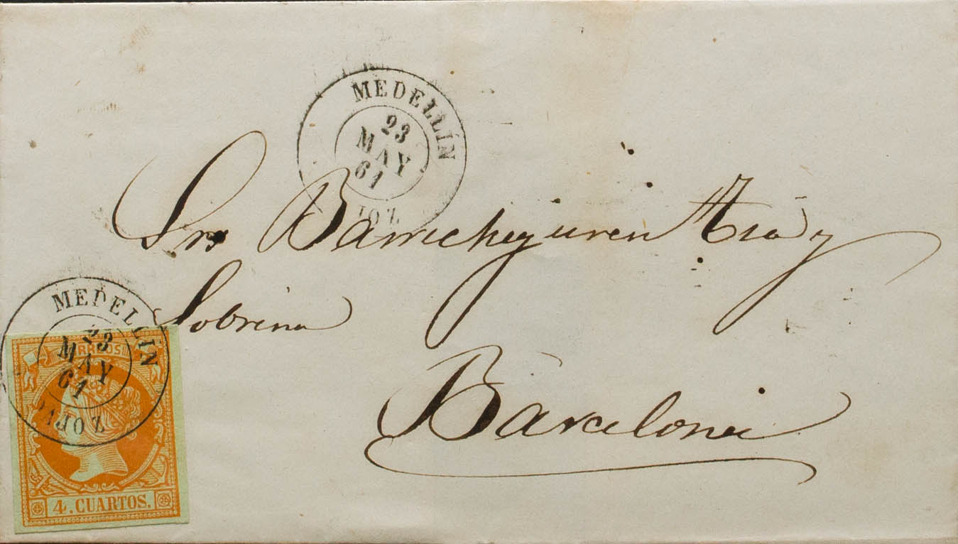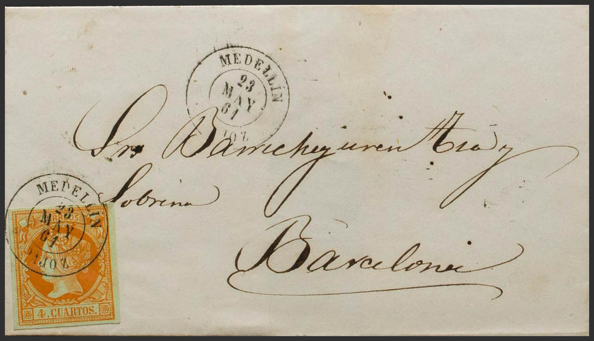 52. 1861. 4 orange cuartos . MEDELLIN to BARCELONA. Postmark MEDELLIN / BADAJOZ. MAGNIFICENT AND UNUSUAL.