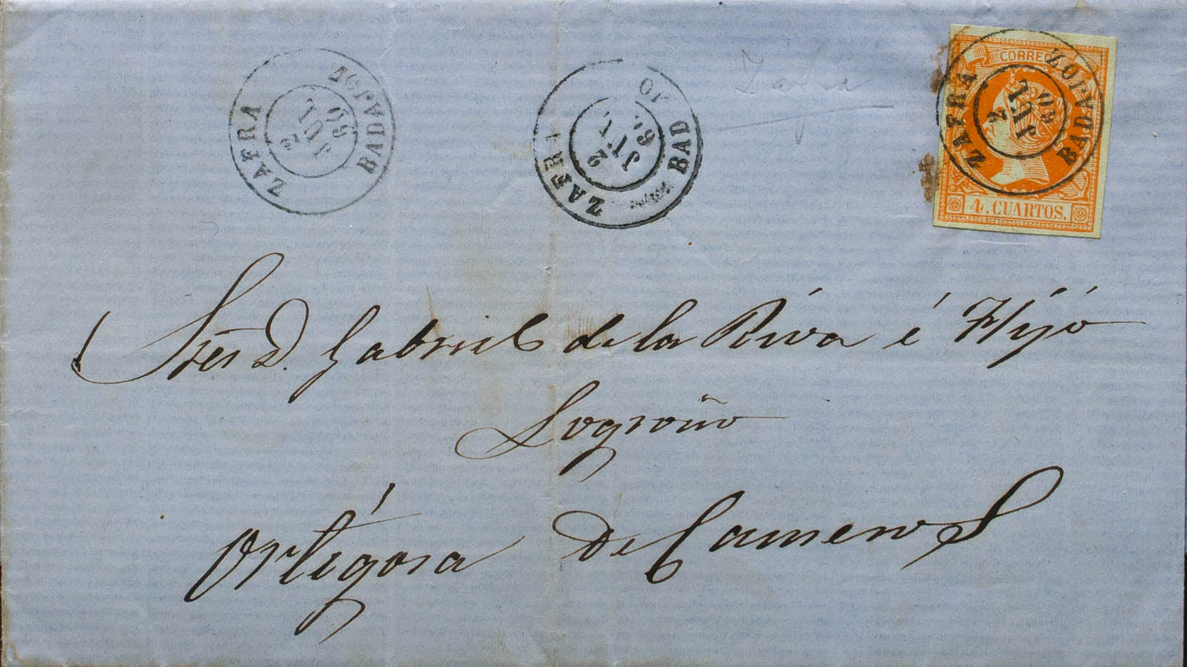 52. 1860. 4 orange cuartos . CROP to ORTIGOSA DE CAMEROS. Postmark ZAFRA / BADAJOZ. MAGNIFICENT.