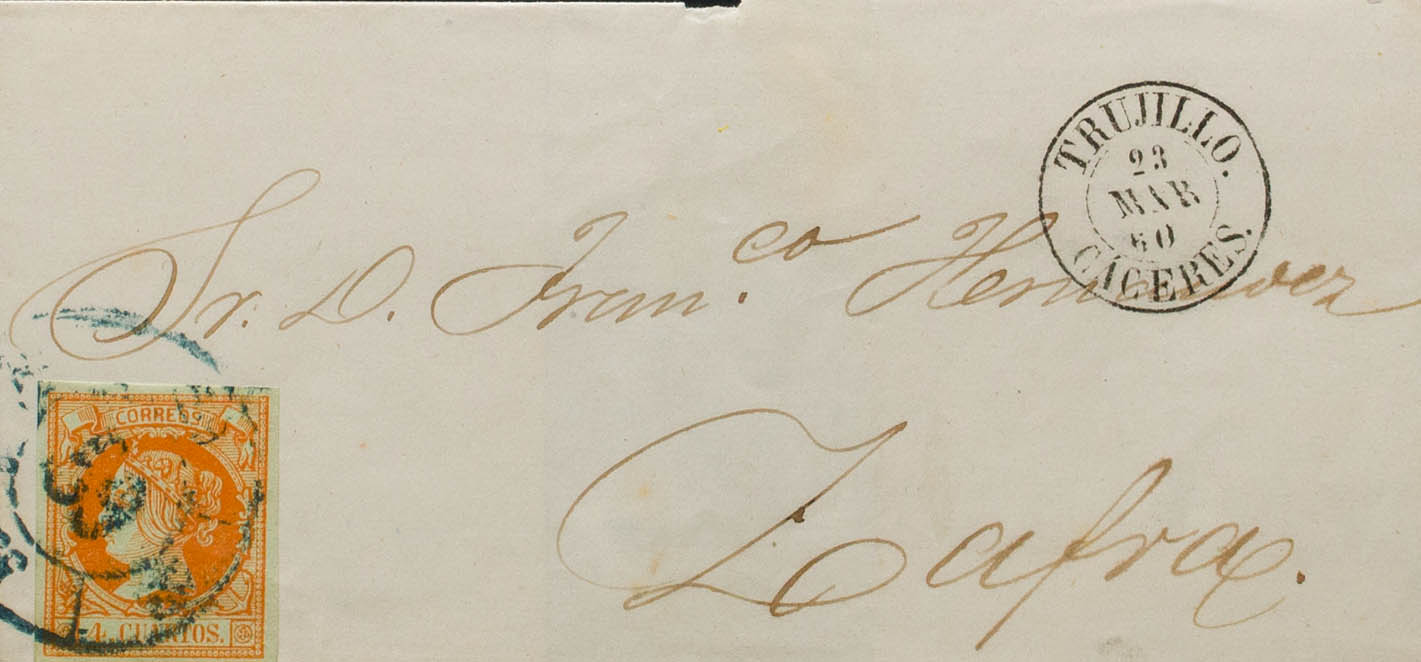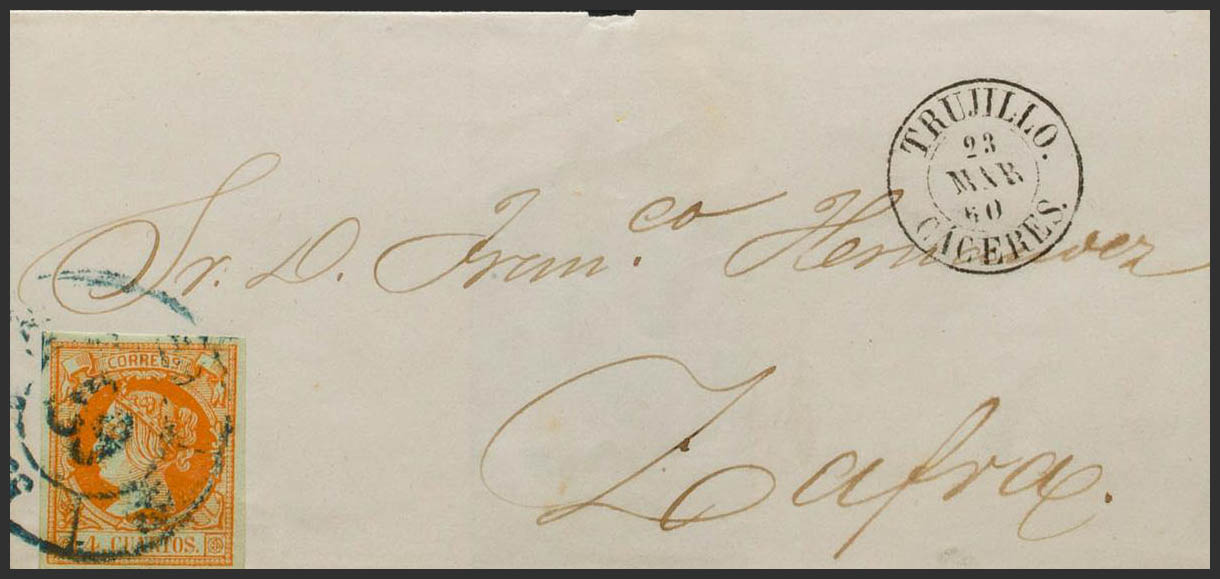52. 1860. 4 orange cuartos . TRUJILLO to ZAFRA. Postmark R. CARRETA Nº59, in blue. MAGNIFICENT.