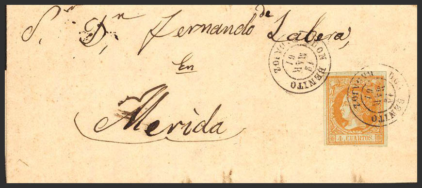 52. 1861. 4 cuartos yellow. DON BENITO to MERIDA. Postmark DON BENITO / BADAJOZ. MAGNIFICENT.
