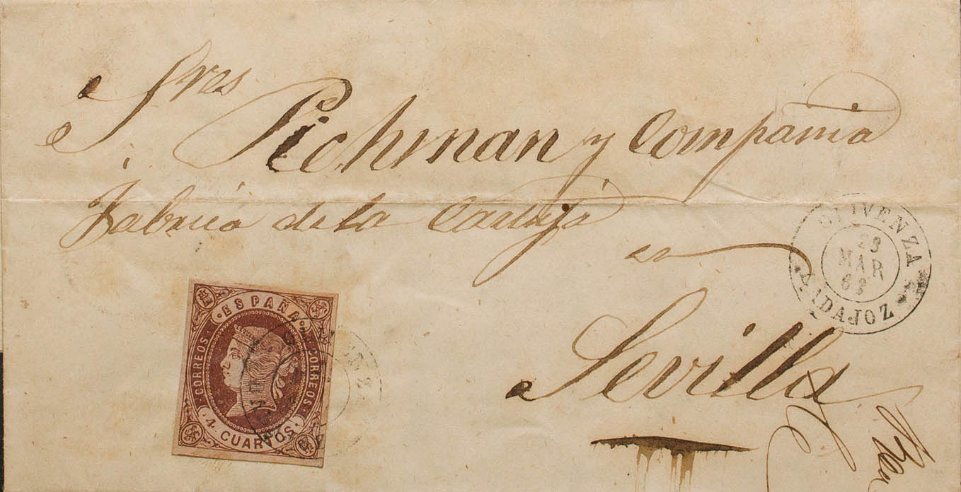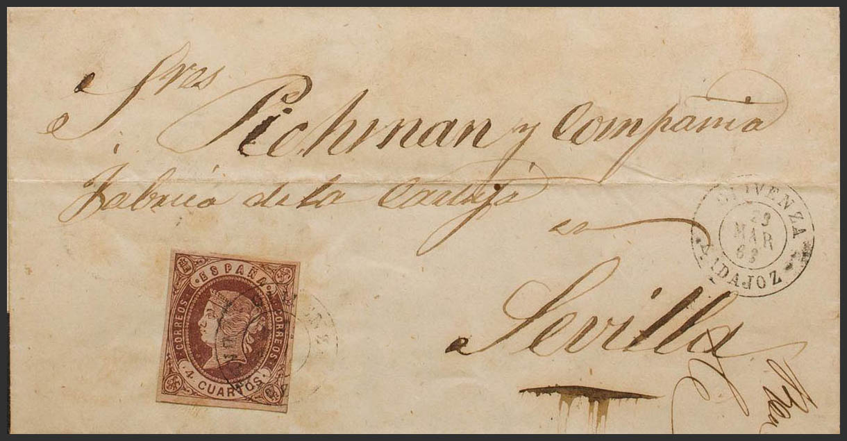 58. 1863. 4- cuartos chestnut. OLIVENZA to SEVILLE. Postmark OLIVENZA / BADAJOZ. MAGNIFICENT AND RARE.