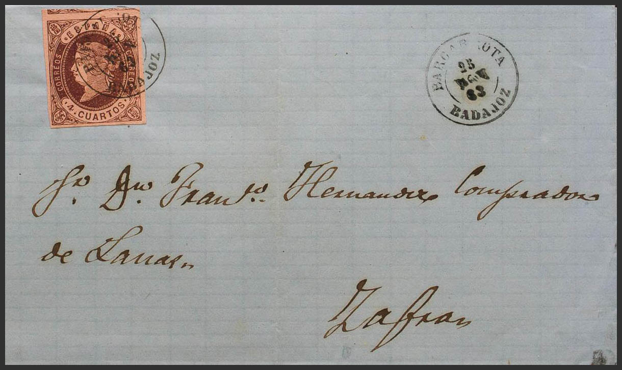 58. 1863. 4- cuartos chestnut. BARCARROTA to ZAFRA. Postmark BARCARROTA / BADAJOZ. MAGNIFICENT AND VERY RARE.