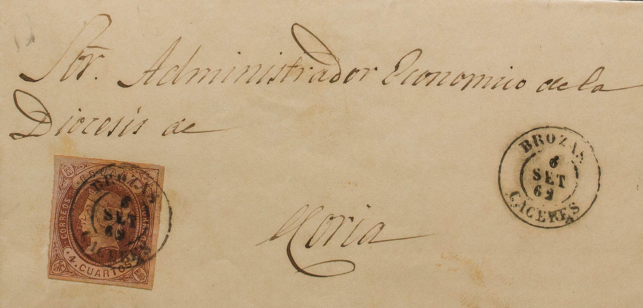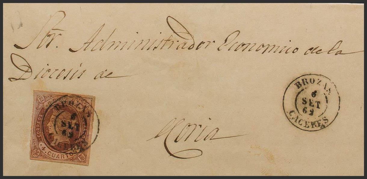 58. 1862. 4- cuartos chestnut. BROZAS to CORIA. Postmark BROZAS / CACERES. MAGNIFICENT AND RARE.