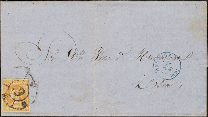 52. 1861. 4 cuartos yellow. BADAJOZ to ZAFRA. Postmark R. CARRETA Nº 19. BEAUTIFUL.