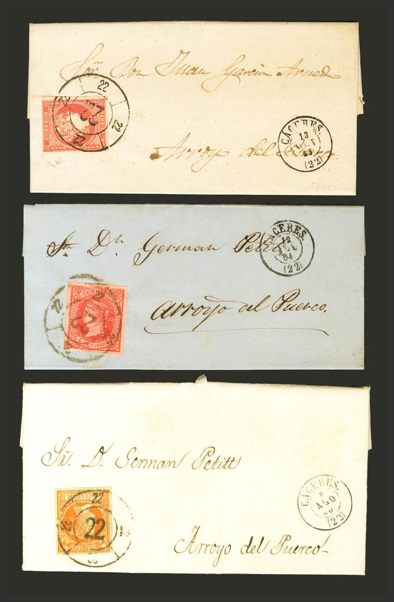 48, 52, 64. (1855ca). Set of three circulated letters with the 4- cuartos red, yellow and pink stamps from CACERES to ARROYO DEL PUERCO, and unused with the postmark R.CARRETA Nº22, from Cáceres. MAGNIFICENT.