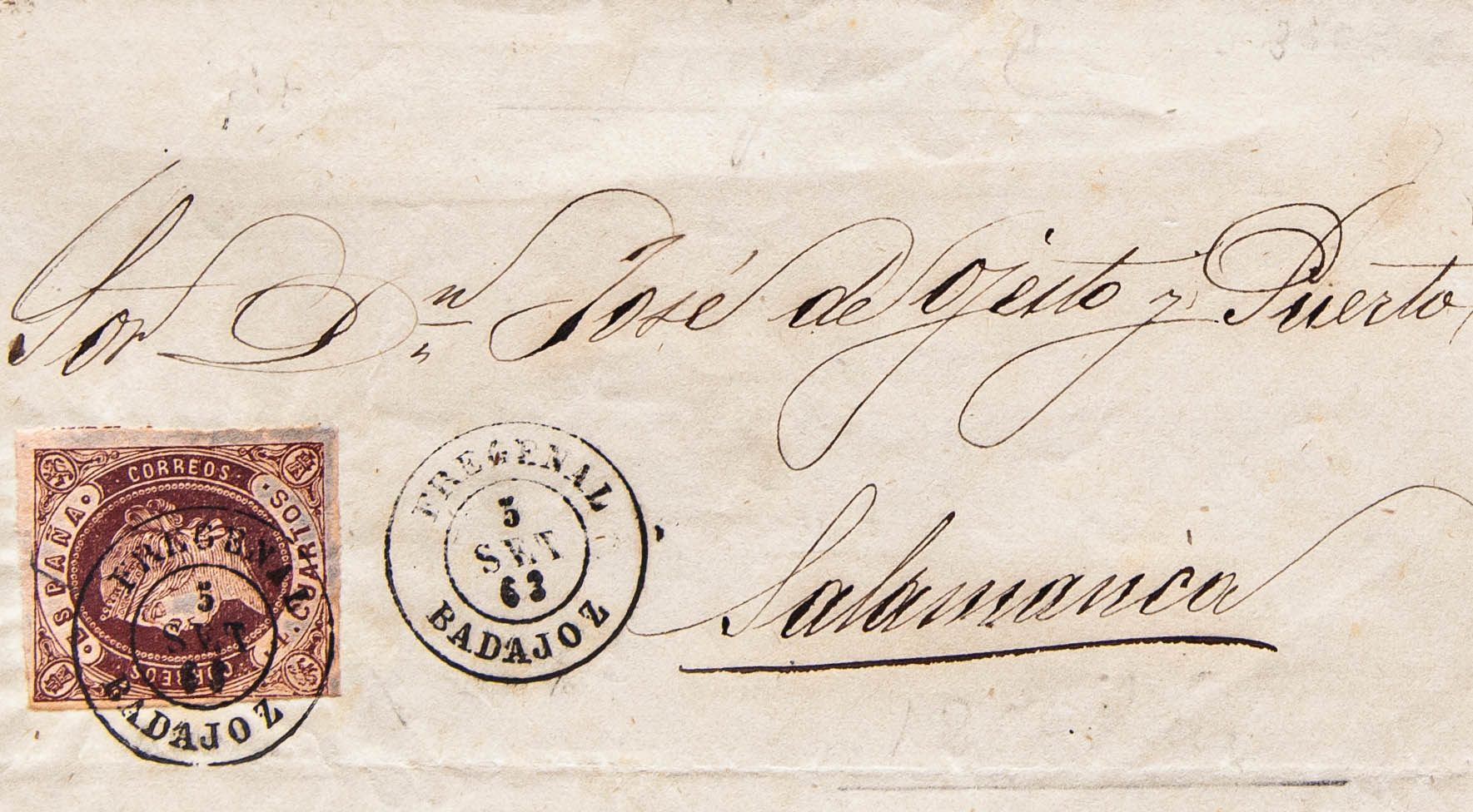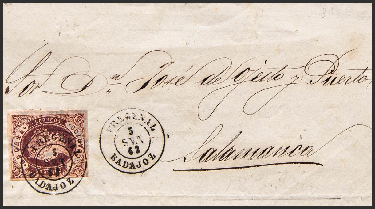 58. 1863. 4 cuartos chestnut. FREGENAL DE LA SIERRA to SALAMANCA. Postmark FREGENAL / BADAJOZ. MAGNIFICENT PRINT.