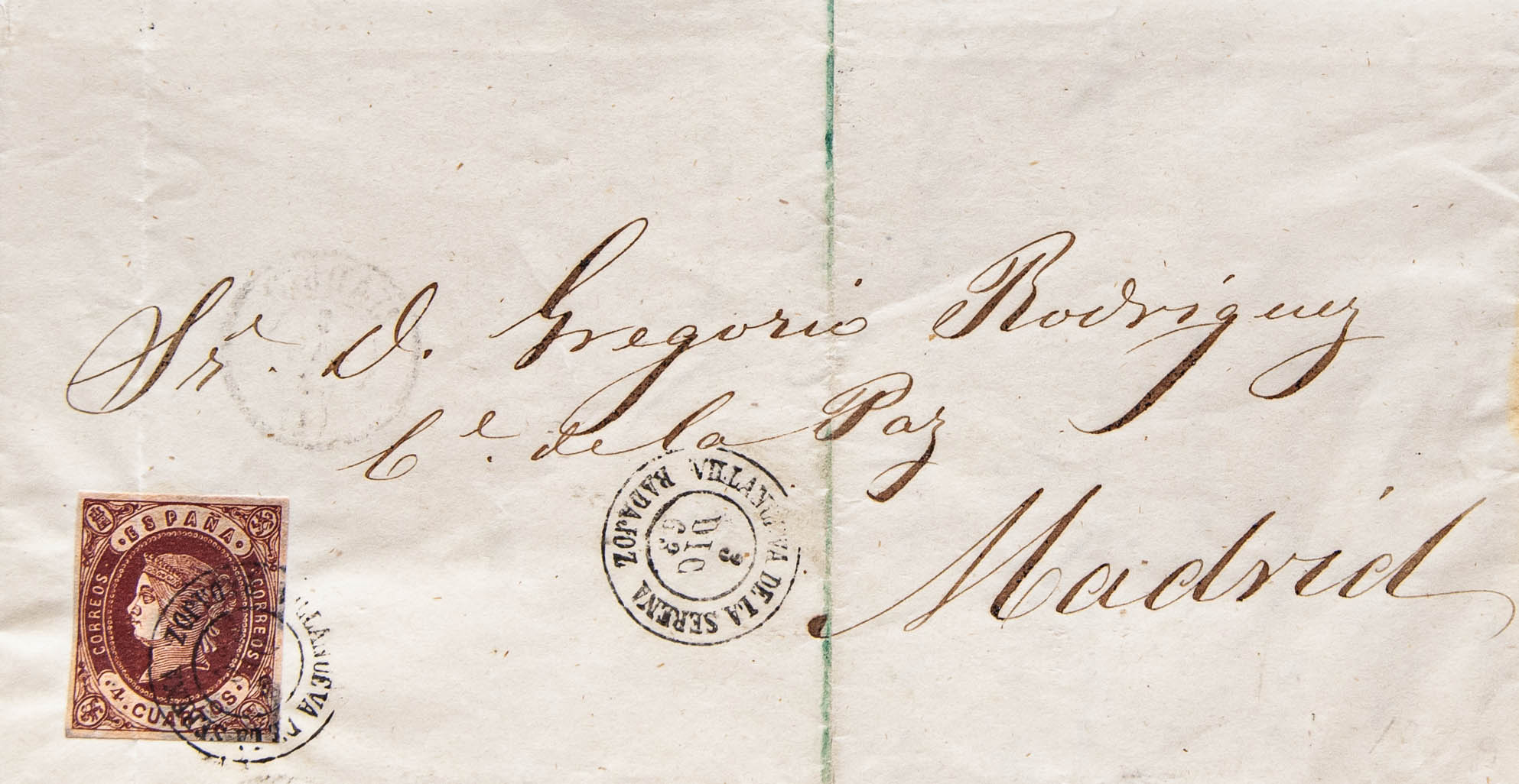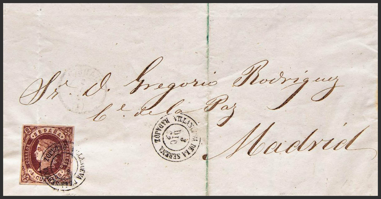 58. 1862. 4 cuartos chestnut. VILLANUEVA DE LA SERENA to MADRID. Postmark VILLANUEVA DE LA SERENA / BADAJOZ. MAGNIFICENT.