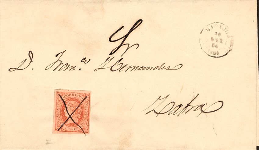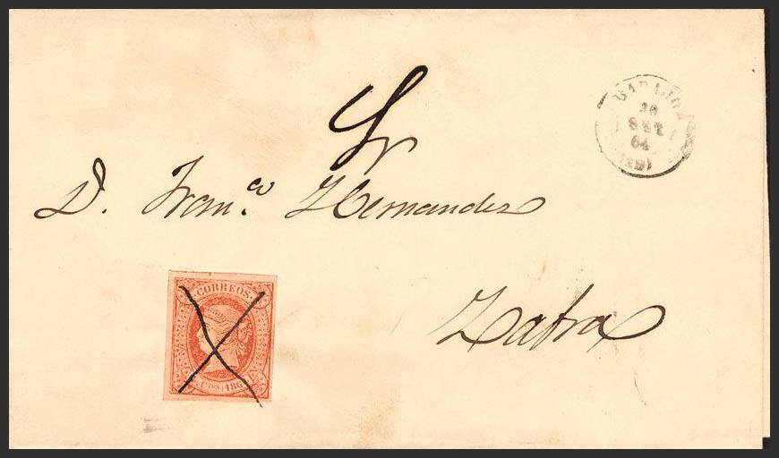 64. 1864. 4 red cuartos . MONTIJO to ZAFRA. INK CROSS postmark. MAGNIFICENT.