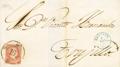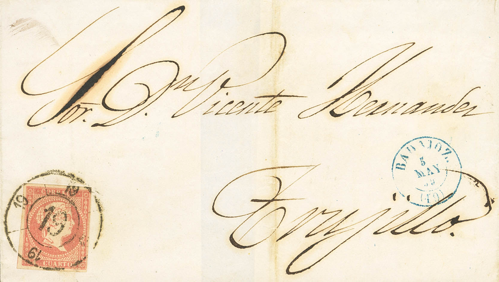 |ABOUT| 48. 1859. 4 quarter red. BADAJOZ to TRUJILLO. Postmark R.CARRETA Nº19. MAGNIFICENT.
