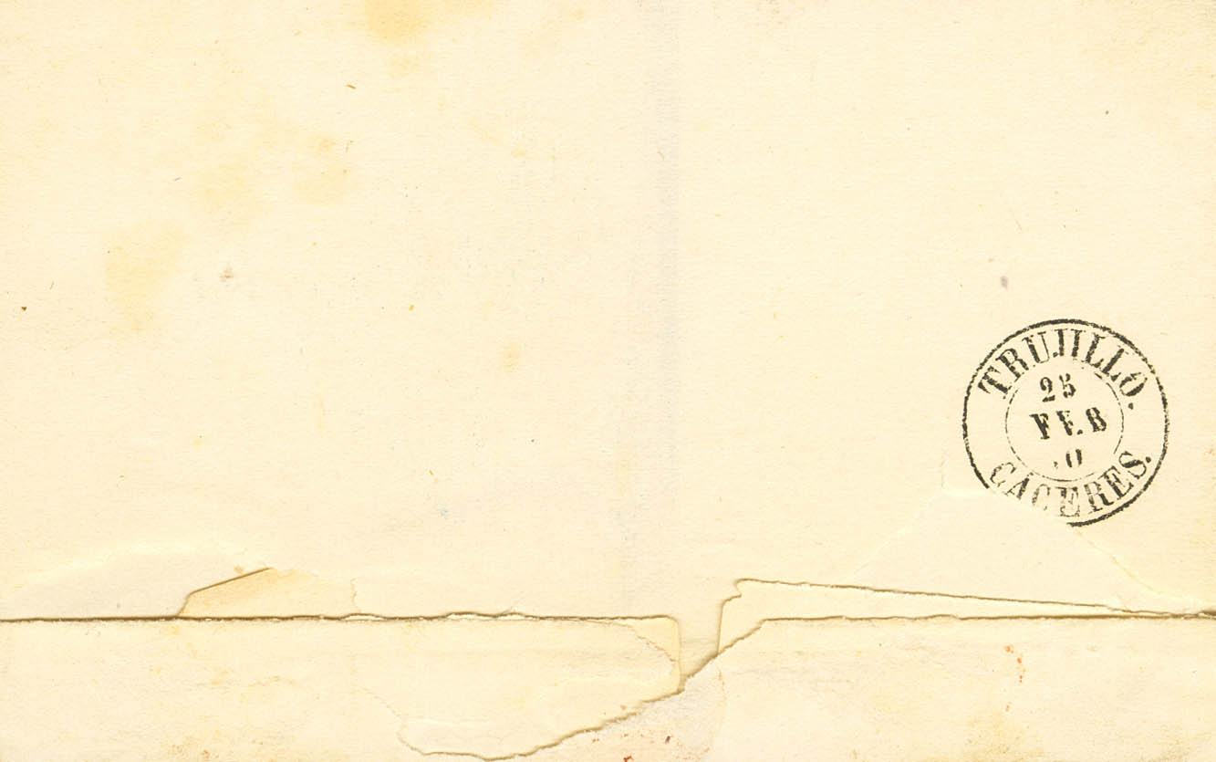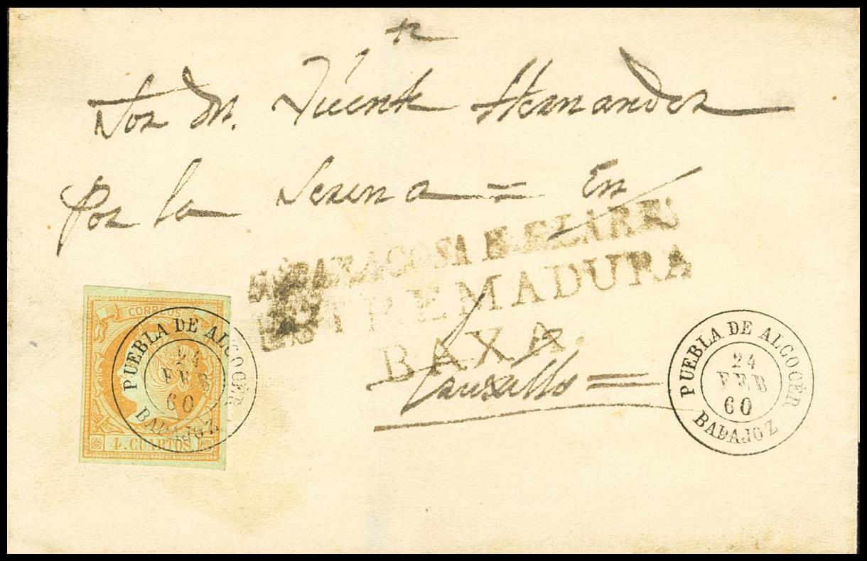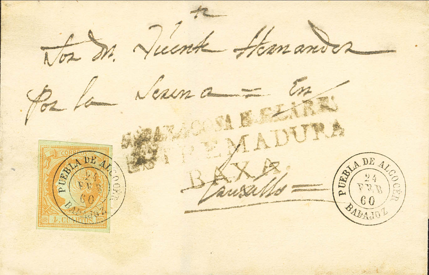 |ABOUT| 52. 1860. 4 orange quarters. ESPARRAGOSA DE LARES to TRUJILLO. Postmark PUEBLA DE ALCOCER / BADAJOZ and on the front pre-philatelic mark ESPARRAGOSA DE LARES / EXTREMADURA / BAXA, in black. MAGNIFICENT AND RARE.