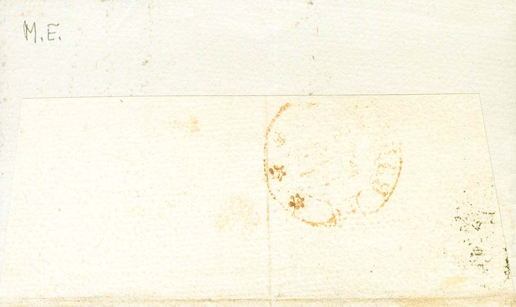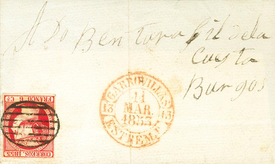 |ABOUT| 17. 1853. 6 carmine quarters. Front (with a flap on the back) from GARROVILLAS (BADAJOZ) to BURGOS. On the front baeza GARROVILLAS / ESTREM.B. MAGNIFICENT.