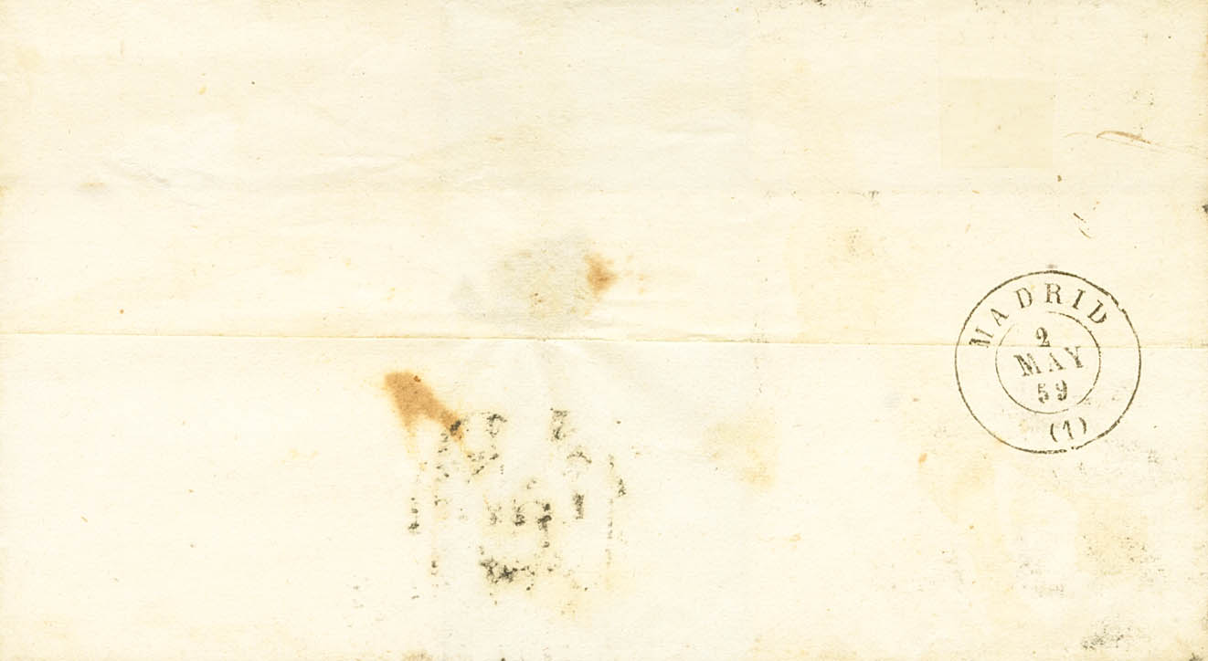 |ENVELOPE| 48. 1859. 4 red quarters. CORIA to MADRID. Postmark CORIA / CACERES (Type I). MAGNIFICENT PRINTING.