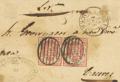 |ABOUT| 33(2). 1855. 4 pink quarters, pair. Front reused from CASILLAS DE CORIA to CACERES. On the front date CORIA / CACERES (Type I). MAGNIFICENT.