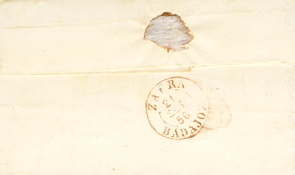 |ABOUT| 44. 1858. 4 red quarters (short corner). On the front, dated BAGoodARROTA / BADAJOZ (Type I). BONITA.