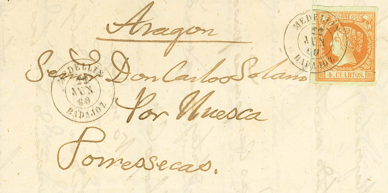 |ABOUT| 52. 1860. 4 orange quarters. MEDELLIN to TORRES SECAS (HUEUncirculatedA). Postmark MEDELLIN / BADAJOZ. MAGNIFICENT AND SPECTACULAR PRINTING.