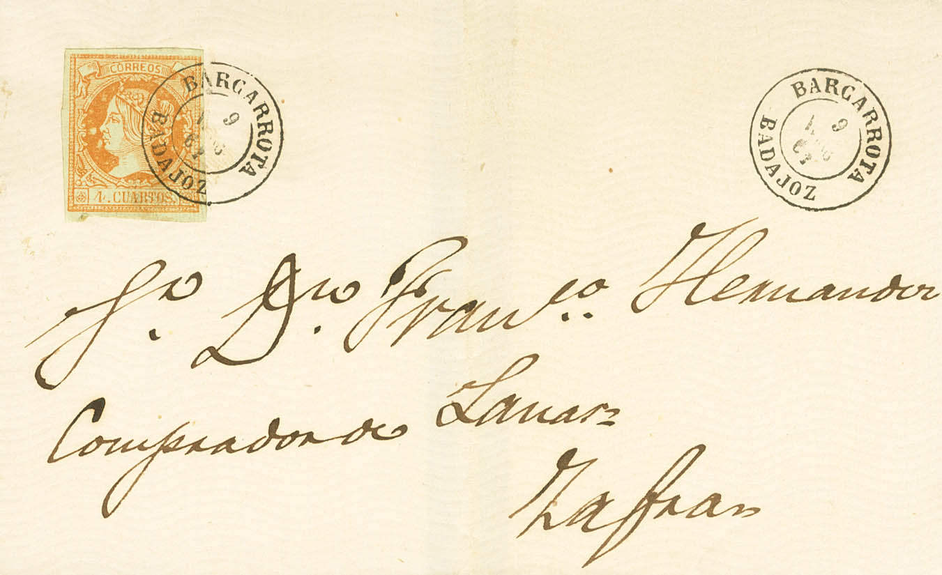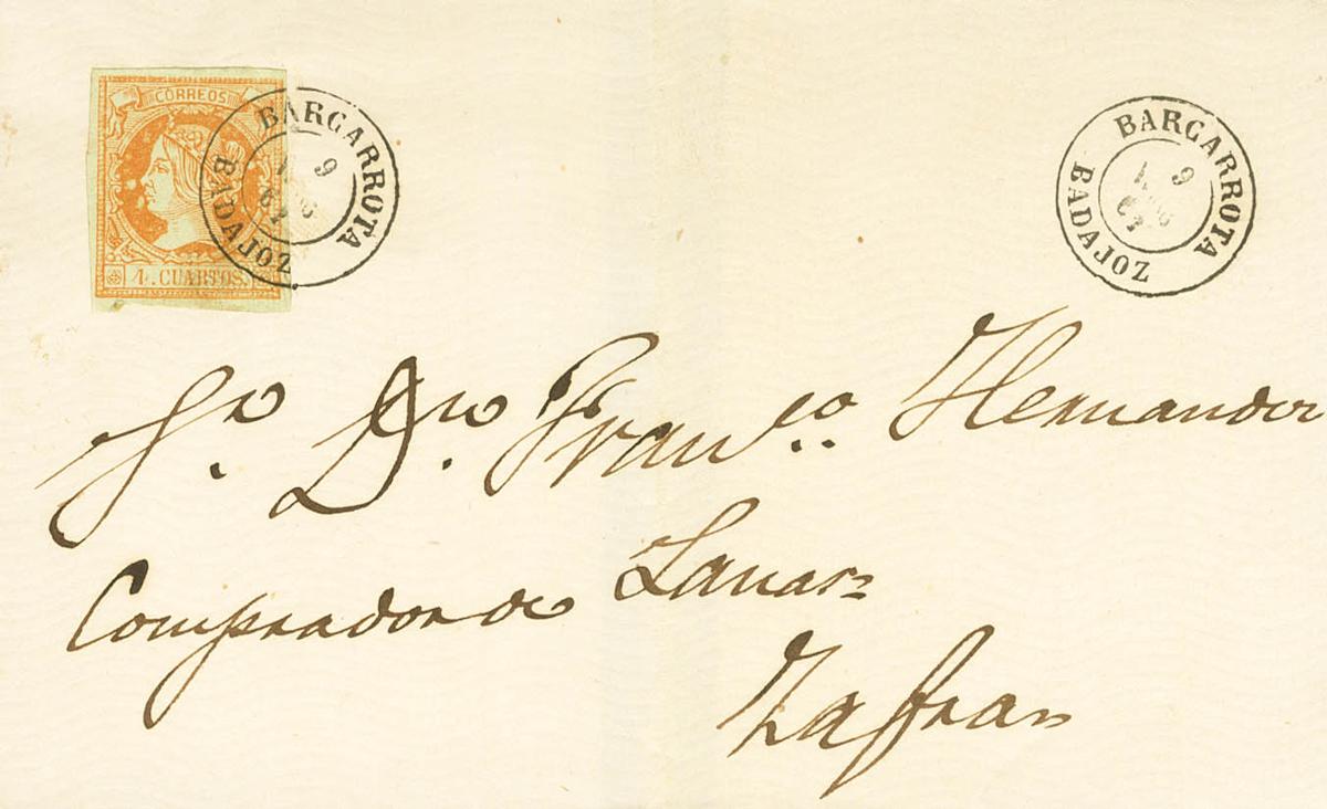 |ENVELOPE| 52. 1861. 4 orange quarters. BAGoodARROTA to ZAFRA (BADAJOZ). Postmark BAGoodARROTA / BADAJOZ. MAGNIFICENT AND VERY RARE, SPECTACULAR PRINTING.