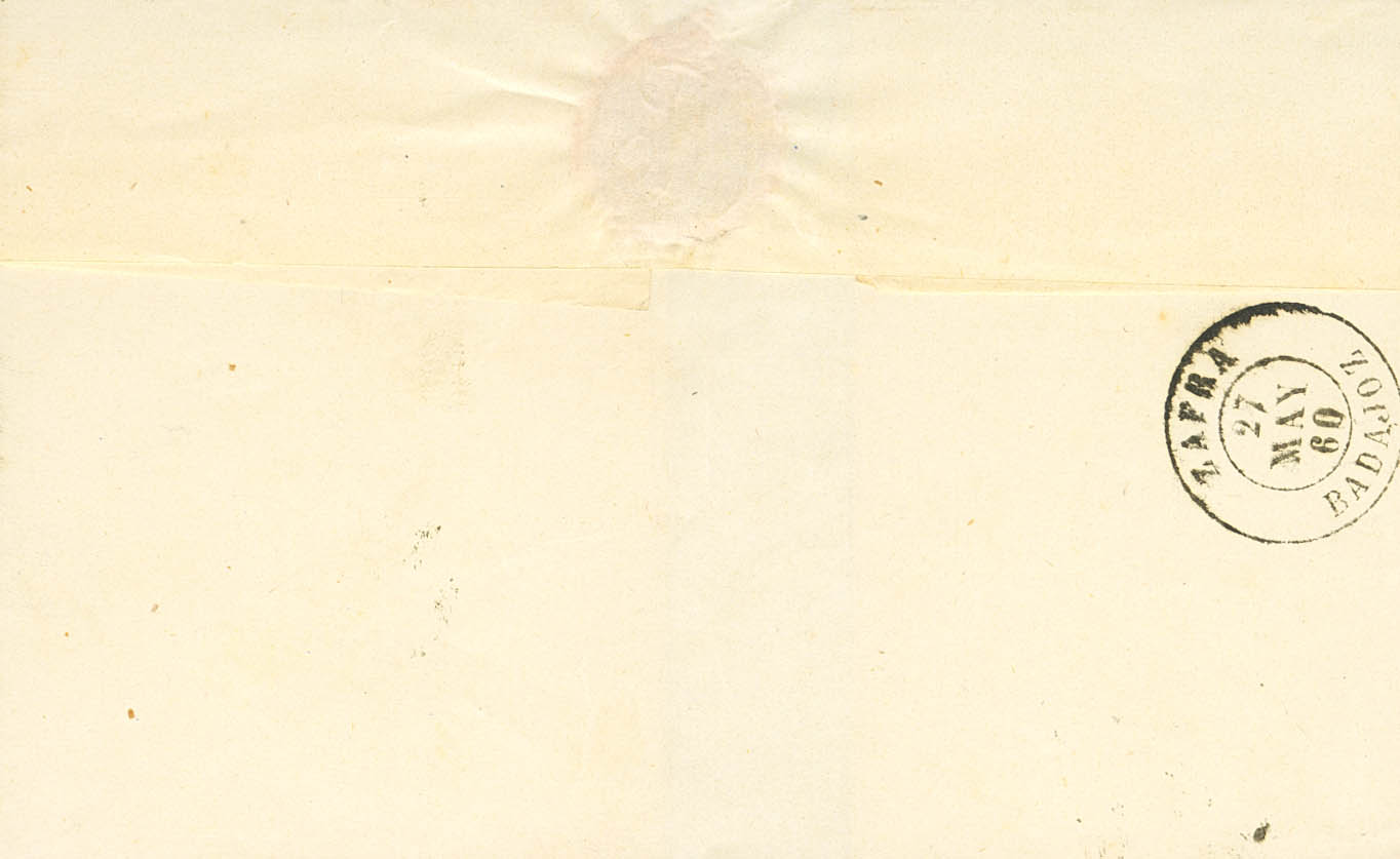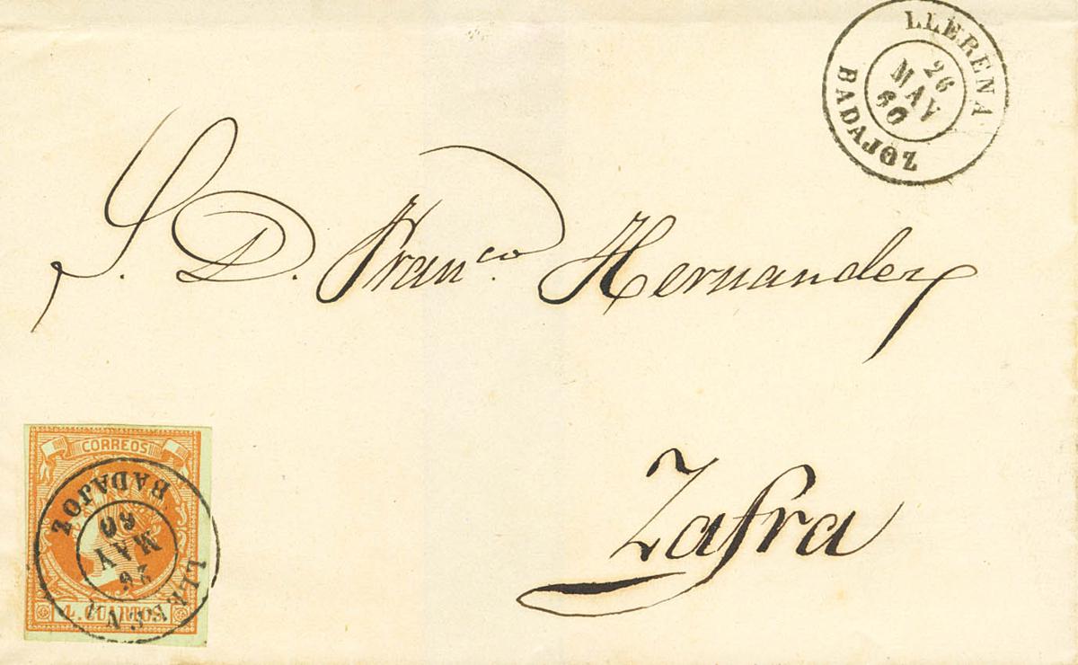 |ABOUT| 52. 1860. 4 orange quarters. LLERENA to ZAFRA (BADAJOZ). Postmark LLERENA / BADAJOZ. MAGNIFICENT AND SPECTACULAR PRINTING.