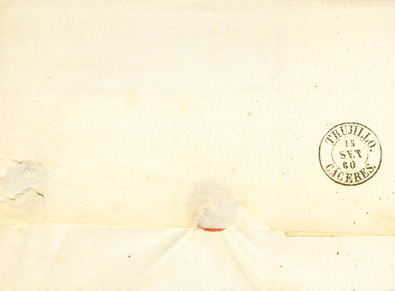 |ABOUT| 52. 1860. 4 orange quarters. ESPARRAGOSA DE LARES to TRUJILLO. Postmark PUEBLA DE ALCOCER / BADAJOZ and on the front pre-philatelic mark ESPARRAGOSA DE LARES / EXTREMADURA / BAXA, in black. MAGNIFICENT AND RARE.