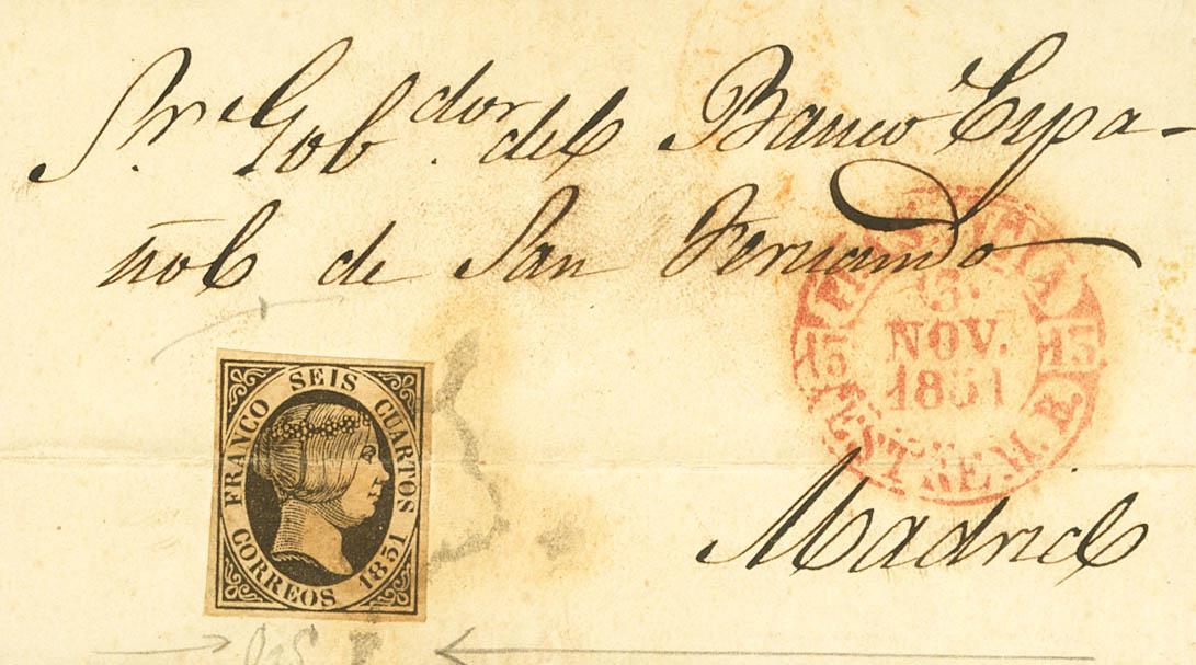 |ENVELOPE| 6. 1851. 6 black quarters (archive fold). PLASENCIA to MADRID. On the front Baeza PLASENCIA / ESTREM.B., in red. NICE.