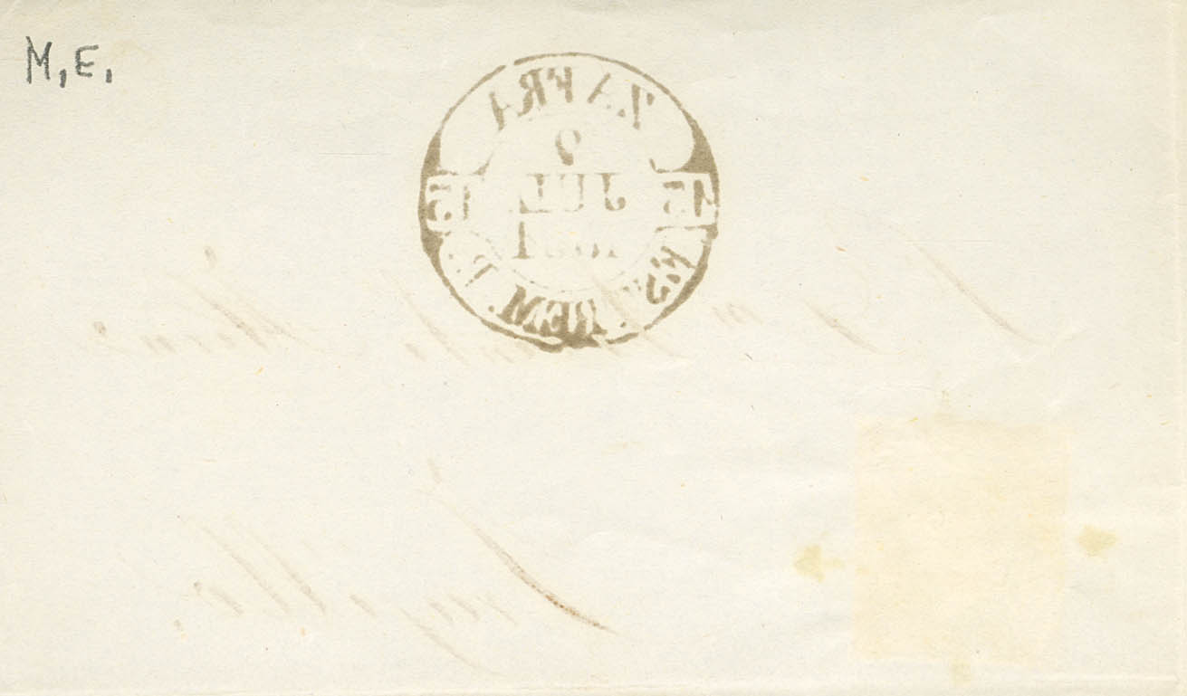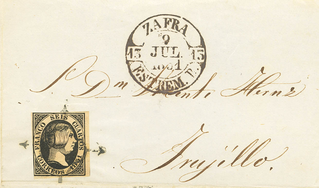 |ABOUT| 6. 1851. 6 black quarters. Front from ZAFRA to TRUJILLO. On the front Baeza ZAFRA / ESTREM.B., in rusty red. MAGNIFICENT.