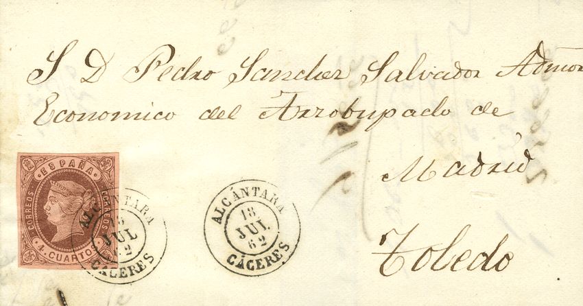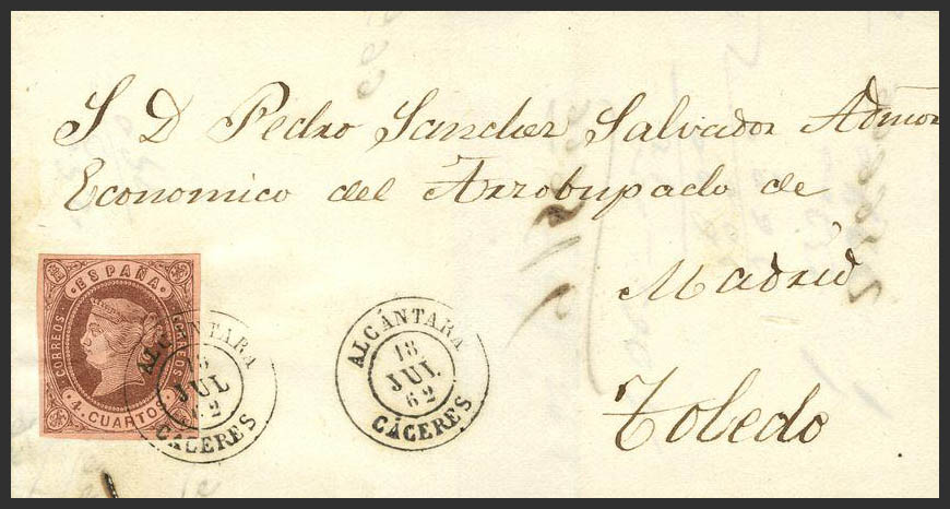 58. 1862. 4- cuartos chestnut. ALCANTARA to TOLEDO. Postmark ALCANTARA / CACERES. MAGNIFICENT.