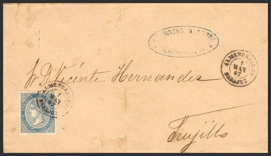 88. 1867. 4 cuartos blue. ALMENDRALEJO to TRUJILLO. Postmark ALMENDRALEJO / BADAJOZ. MAGNIFICENT.