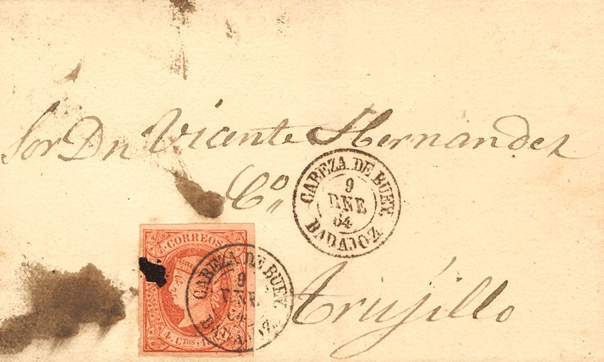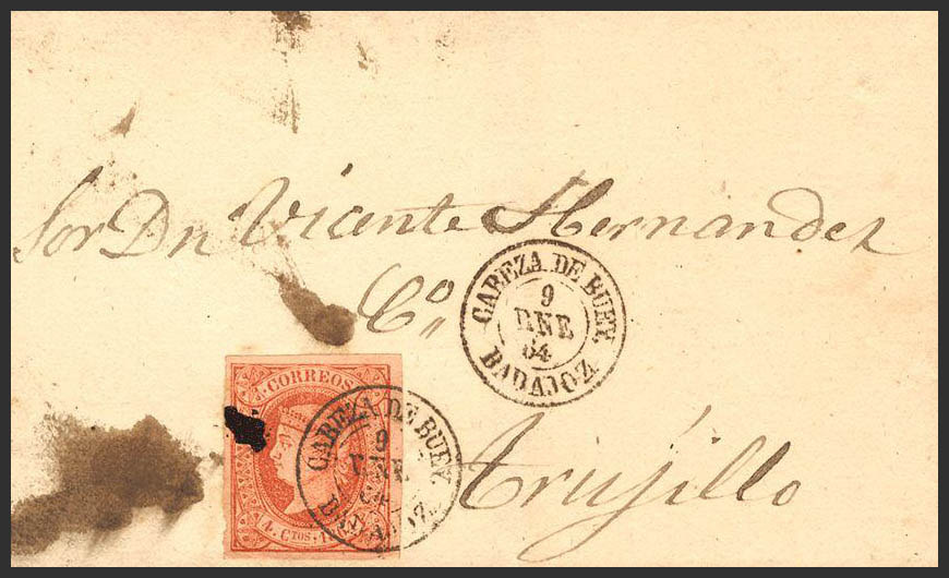 64. 1864. 4 cuartos pink. HEAD OF THE OX to TRUJILLO. Postmark HEAD OF THE OX / BADAJOZ. MAGNIFICENT AND RARE.