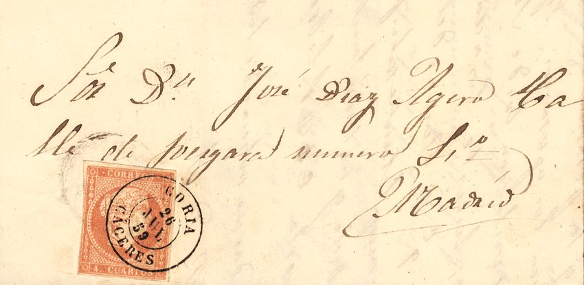 48. 1859. 4 red cuartos . CORIA to MADRID. Postmark CORIA / CACERES. MAGNIFICENT.