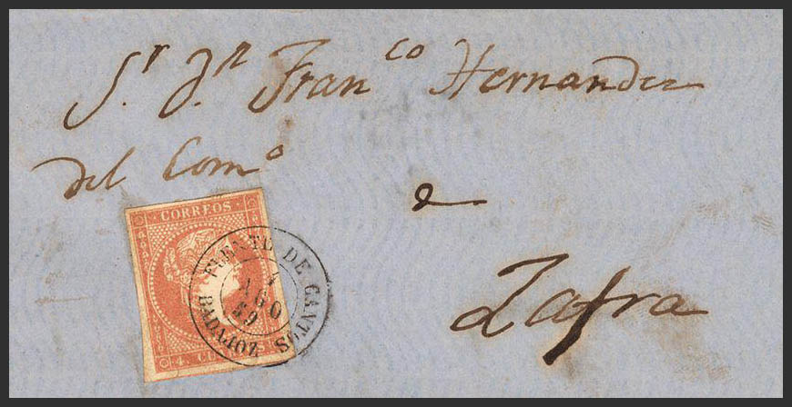48. 1859. 4 red cuartos . SOURCE OF SONGS to ZAFRA. Postmark SOURCE OF CANTOS / BADAJOZ. MAGNIFICENT.