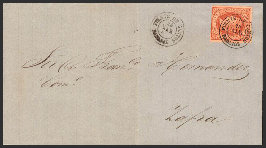 64. 1864. 4 cuartos pink. SOURCE OF SONGS to ZAFRA. Postmark SOURCE OF CANTOS / BADAJOZ. MAGNIFICENT AND RARE.