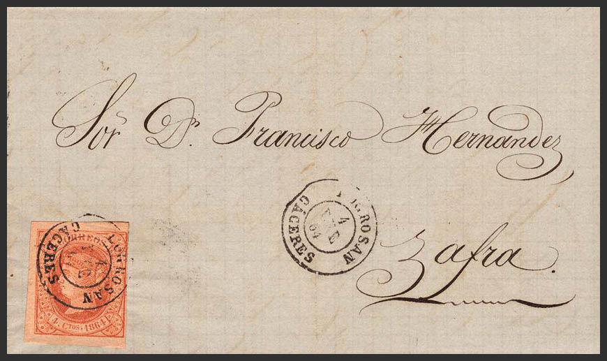 64. 1864. 4 cuartos pink. THEY ACHIEVE THE CROP. Postmark LOGROSAN / CACERES. MAGNIFICENT.