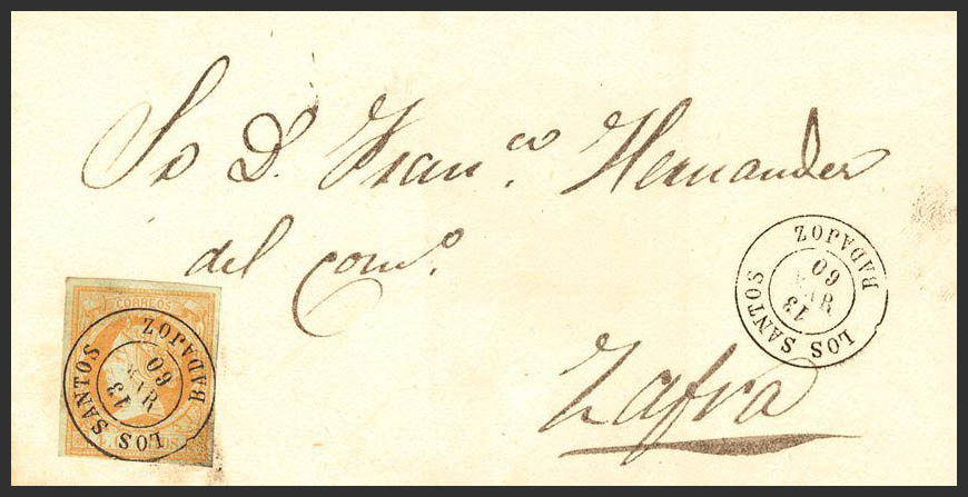 52. 1860. 4 cuartos yellow. LOS SAINTS to CROP. Postmark LOS SANTOS / BADAJOZ. MAGNIFICENT AND RARE.