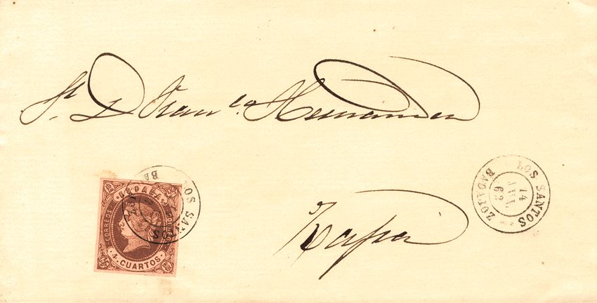58. 1863. 4- cuartos chestnut. LOS SAINTS to CROP. Postmark LOS SANTOS / BADAJOZ. MAGNIFICENT AND VERY RARE.