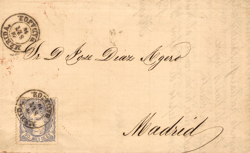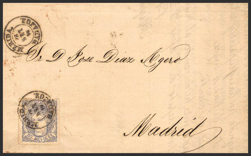 107. 1870. 50 mils blue. MERIDA to MADRID. Postmark MERIDA / BADAJOZ. MAGNIFICENT.