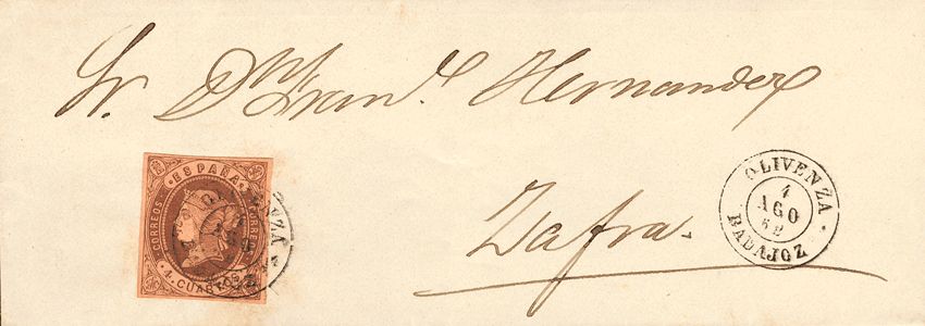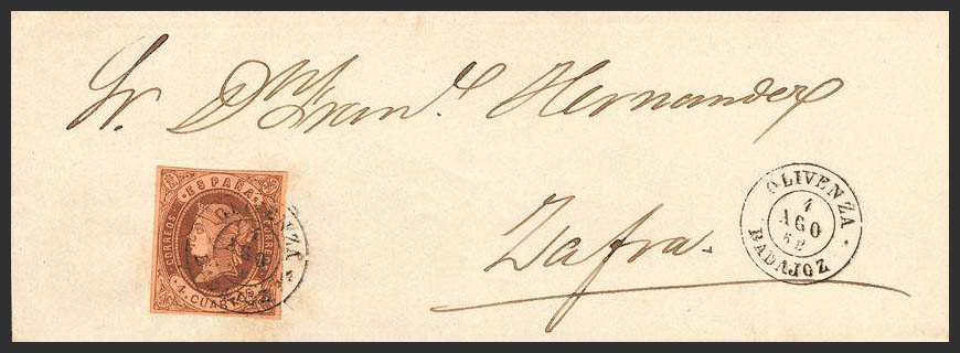 58. 1862. 4- cuartos chestnut. OLIVENZA to ZAFRA. Postmark OLIVENZA / ZAFRA. MAGNIFICENT.