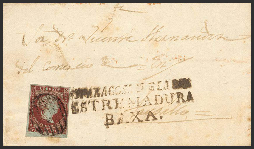 40. (1855ca). 4 red cuartos . Front of ESPARRAGOSA DE LARES to TRUJILLO. On the front pre-philatelic mark ESPARRAGOSA DE LARES / ESTRMADURA / BAXA. MAGNIFICENT.