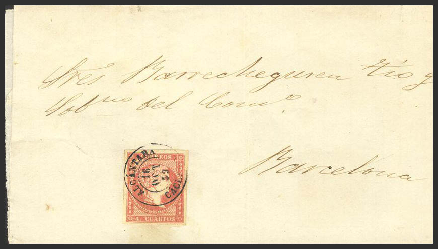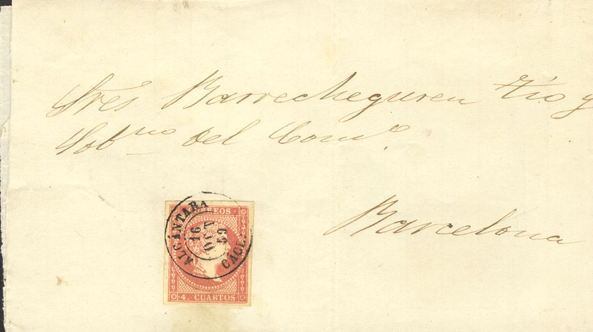 48. 1859. 4 red cuartos . ALCANTARA to BARCELONA. Postmark ALCANTARA / CACERES. MAGNIFICENT.