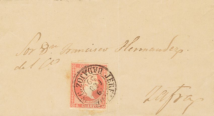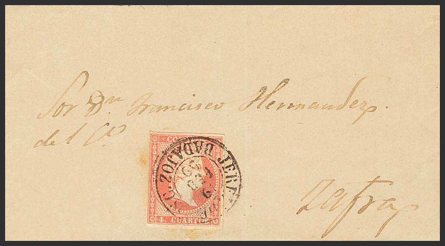 48. 1859. 4 red cuartos . SHERRY OF THE KNIGHTS to ZAFRA. Postmark JEREZ DE LOS C. / BADAJOZ (Type I). MAGNIFICENT.