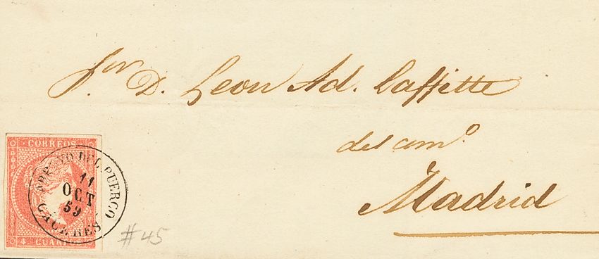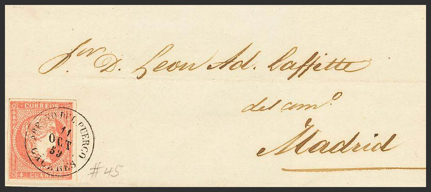48. 1859. 4 red cuartos . ARROYO DEL PUERCO to MADRID. Postmark ARROYO DEL PUERCO / CACERES. MAGNIFICENT AND VERY RARE.