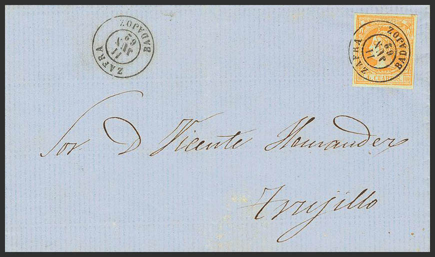 52. 1862. 4 orange cuartos . ZAFRA to TRUJILLO. Postmark ZAFRA / BADAJOZ. MAGNIFICENT.