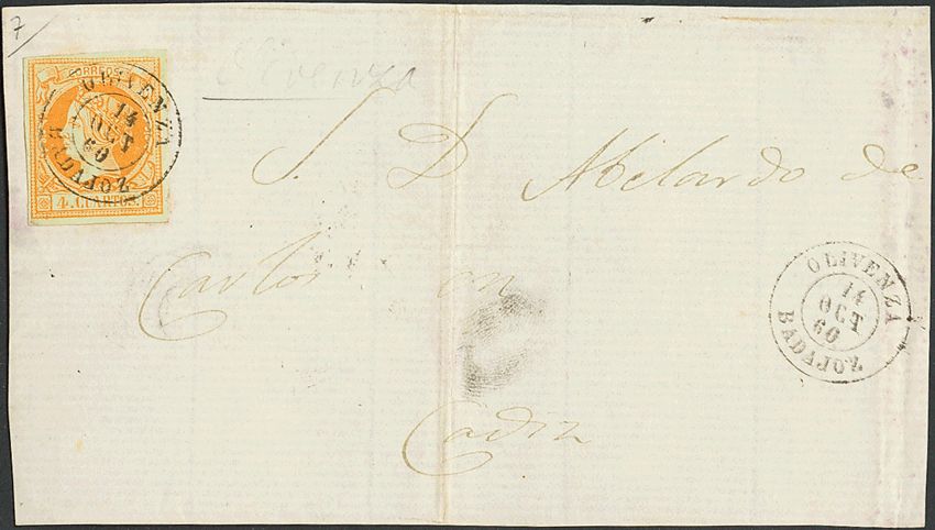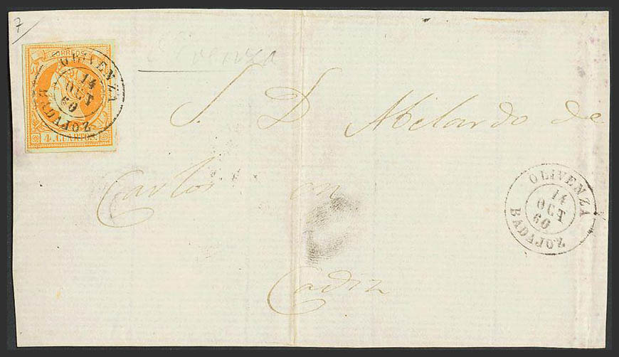 52. 1860. 4 orange cuartos . Front from OLIVENZA to CADIZ. Postmark OLIVENZA / BADAJOZ. MAGNIFICENT.