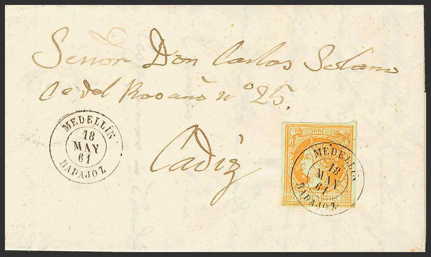 52. 1861. 4 orange cuartos . MEDELLIN to CADIZ. Postmark MEDELLIN / BADAJOZ. MAGNIFICENT AND VERY RARE.