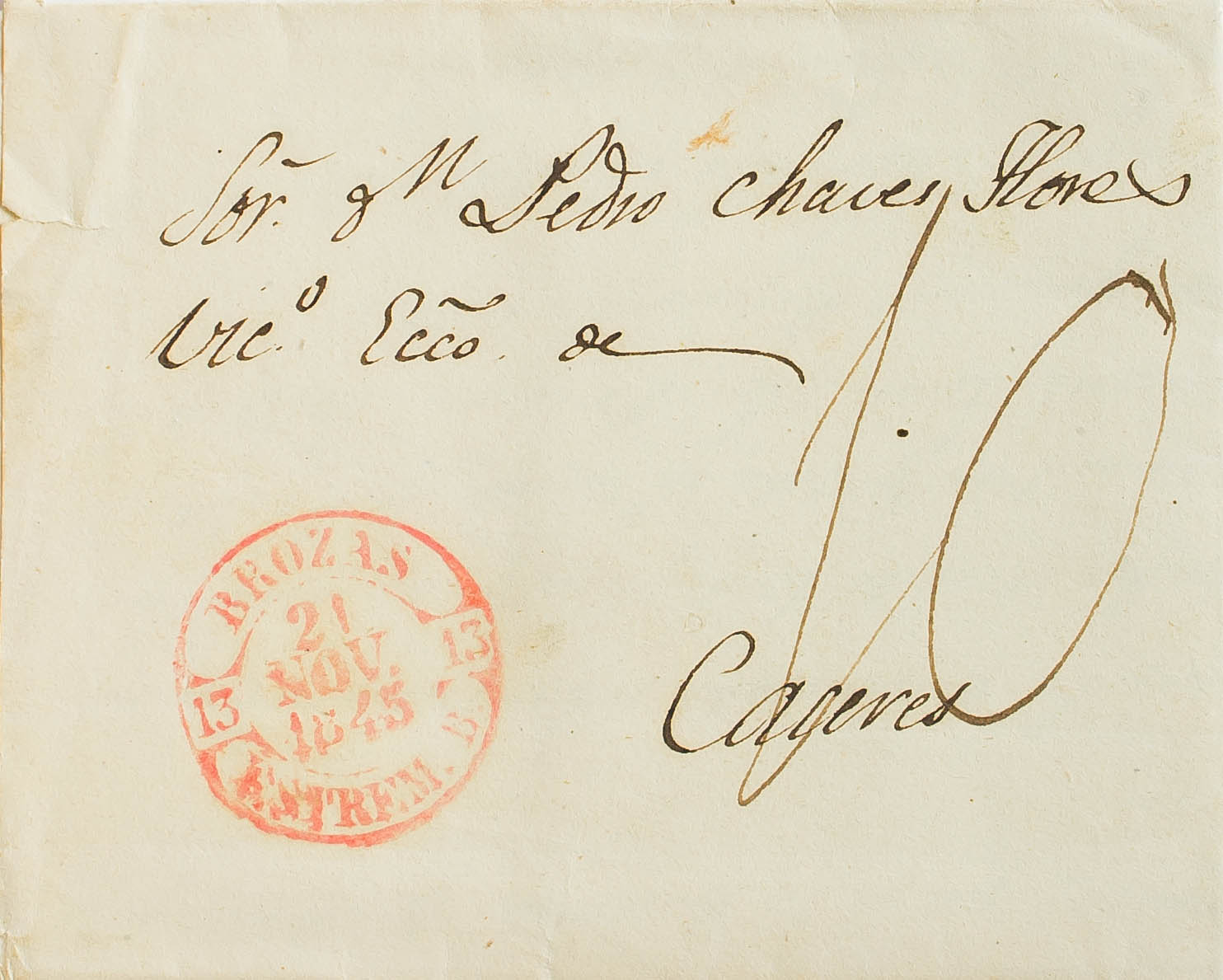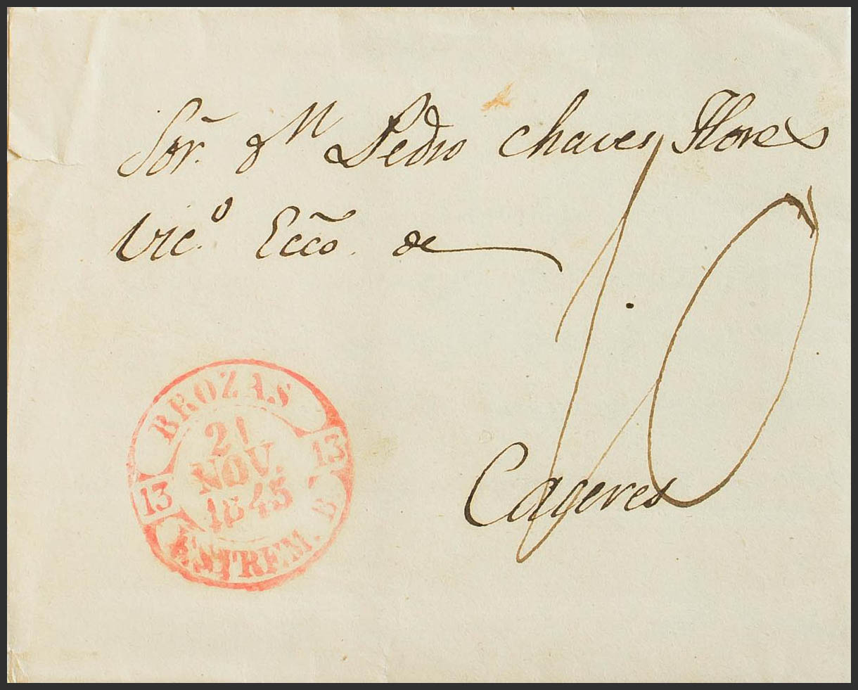 1845. BROZAS to CACERES. Baeza BROZAS / ESTREM. B, in red. MAGNIFICENT.