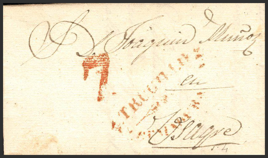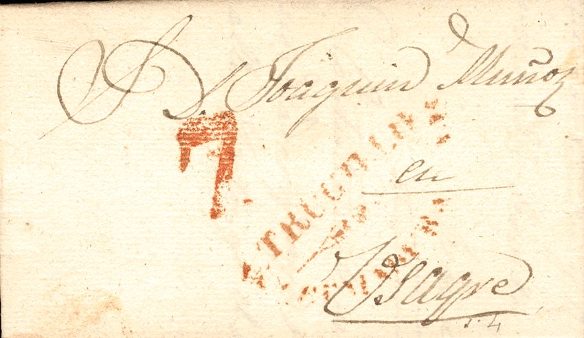 English 1838. TRUJILLO to USACRE. TRUGILLO / ESTRMADURA / BAJA brand, in red. MAGNIFICENT.