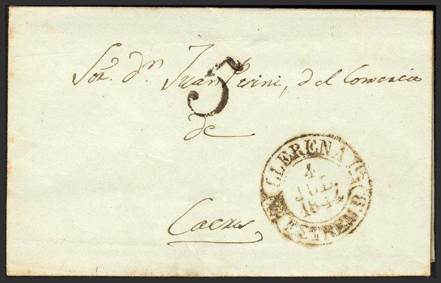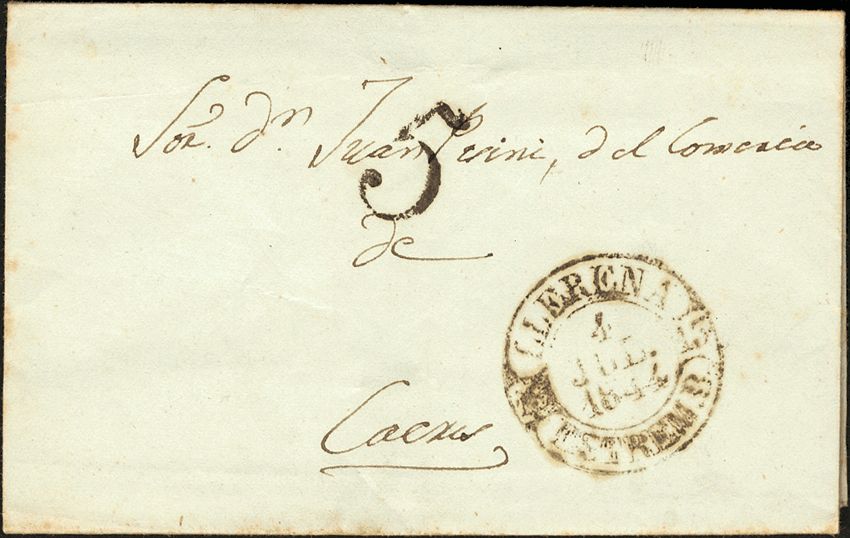 1844. LLERENA to CACERES. Baeza brand LLERENA / ESTREM. B, in black. MAGNIFICENT AND RARE.
