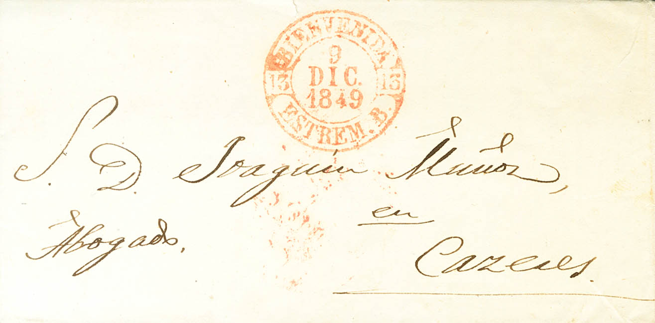 |ABOUT|1849. WELCOME (BADAJOZ) to CACERES. Baeza WELCOME / ESTREM.B., in red. MAGNIFICENT.
