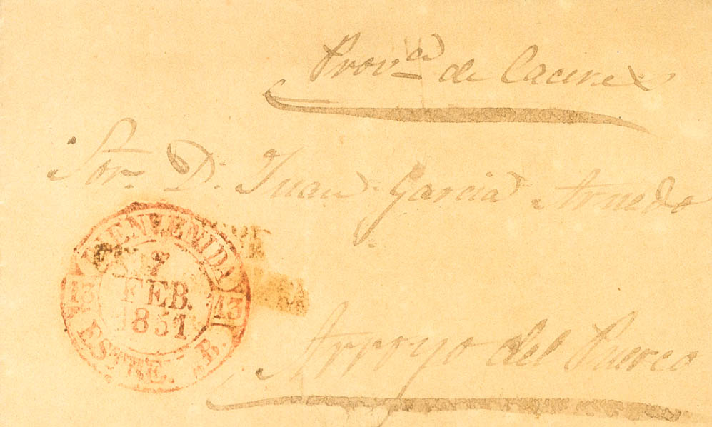 |ABOUT|1851. USAGRE (BADAJOZ) to ARROYO DEL PUEGoodO. USAGRE / ESTREMADURA / BAJA brand, in red (PE1) 2004 edition and baeza BIENVENIDA / ESTREM.B., in red, applied in transit. MAGNIFICENT AND UNUSUAL.