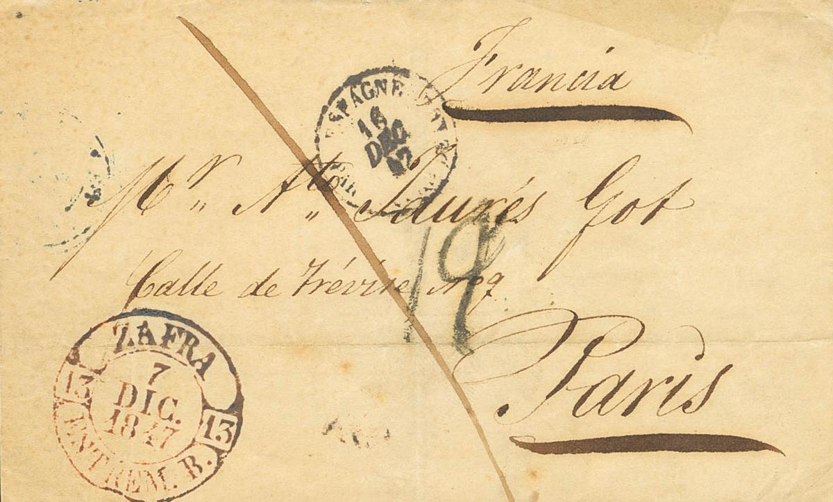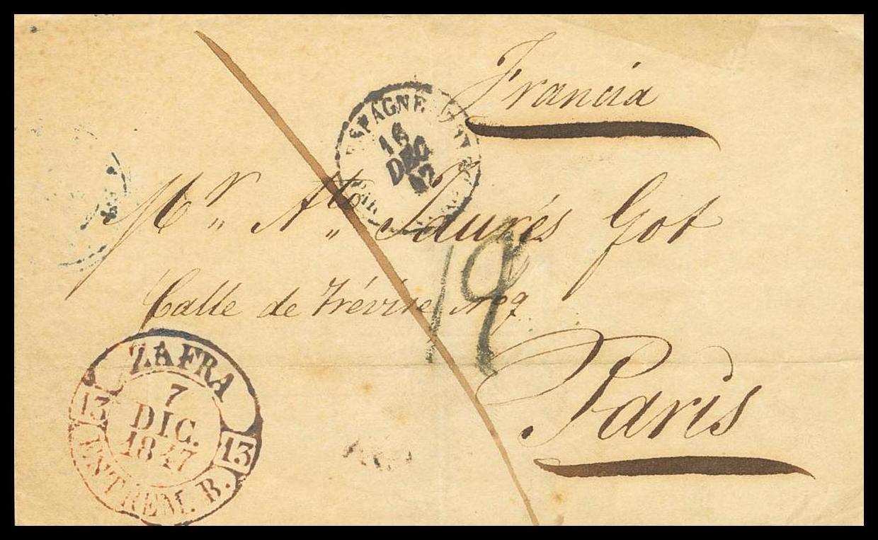 |ABOUT|1847. ZAFRA to PARIS (FRANCE). Baeza ZAFRA / ESTREM.B., in red. MAGNIFICENT.